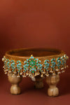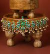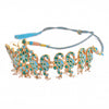 Featuring a gold plated Peacock inspired Choker using light blue and turquoise meena work from Jaipur, anchored with pearl clusters, set in customised metal alloy